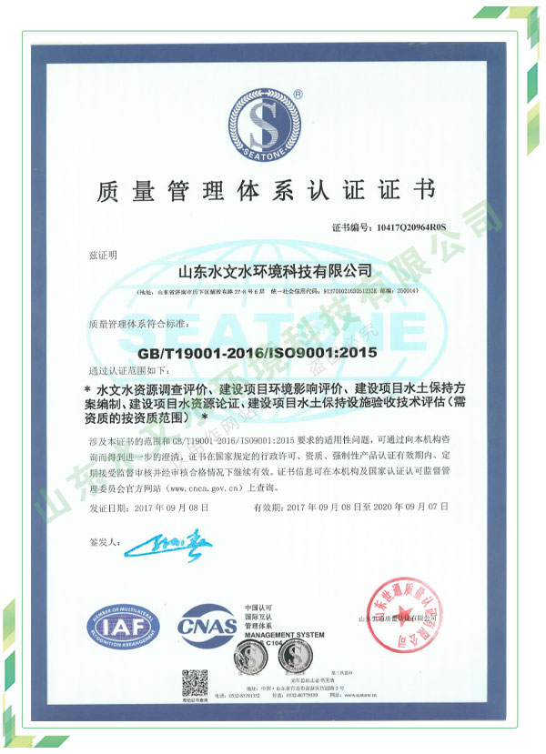 公司擁有水利工程設計、水土保持、水文水資源調(diào)查評價、水資源論證、建設項目環(huán)境影響評價、市政公用工程施工總承包、水利水電工程施工總承包、電子與智能化工程專業(yè)承包等資質(zhì),2017年通過質(zhì)量管理體系、環(huán)境管理體系、職業(yè)健康安全管理體系認證;2020年被評為國家級高新技術企業(yè),同年被中國水利企業(yè)協(xié)會推薦為第一批“合同節(jié)水服務企業(yè)”;2021年被山東省、濟南市評為 “專精特新”中小企業(yè)。業(yè)務范圍涉及水利工程設計;節(jié)水設計、改造、水平衡測試;山洪災害調(diào)查;城市水資源調(diào)查評價;建設項目水土保持方案編制、監(jiān)測、驗收、水土保持規(guī)劃;水安全保障規(guī)劃、建設項目水資源論證、規(guī)劃水資源論證;建設項目環(huán)境影響評價;入河排污口論證;防洪影響評價;市政公用工程施工、水利水電工程施工、電子與智能化工程施工等。